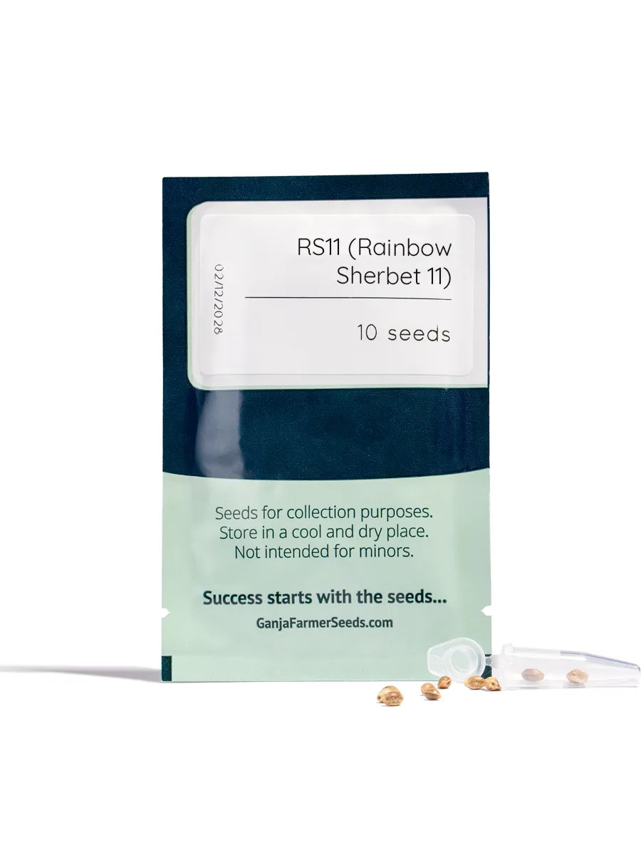 RS11 (Rainbow Sherbet) je feminizovaná fotoperiodická odrůda s převahou genů sativy (60 % Sativa / 40 % Indica), vzniklá křížením Pink Guava × OZK. Jde o moderní genetiku prémiové třídy, ceněnou pro velmi vysoký obsah THC, stabilní strukturu a výrazný aromatický profil.
